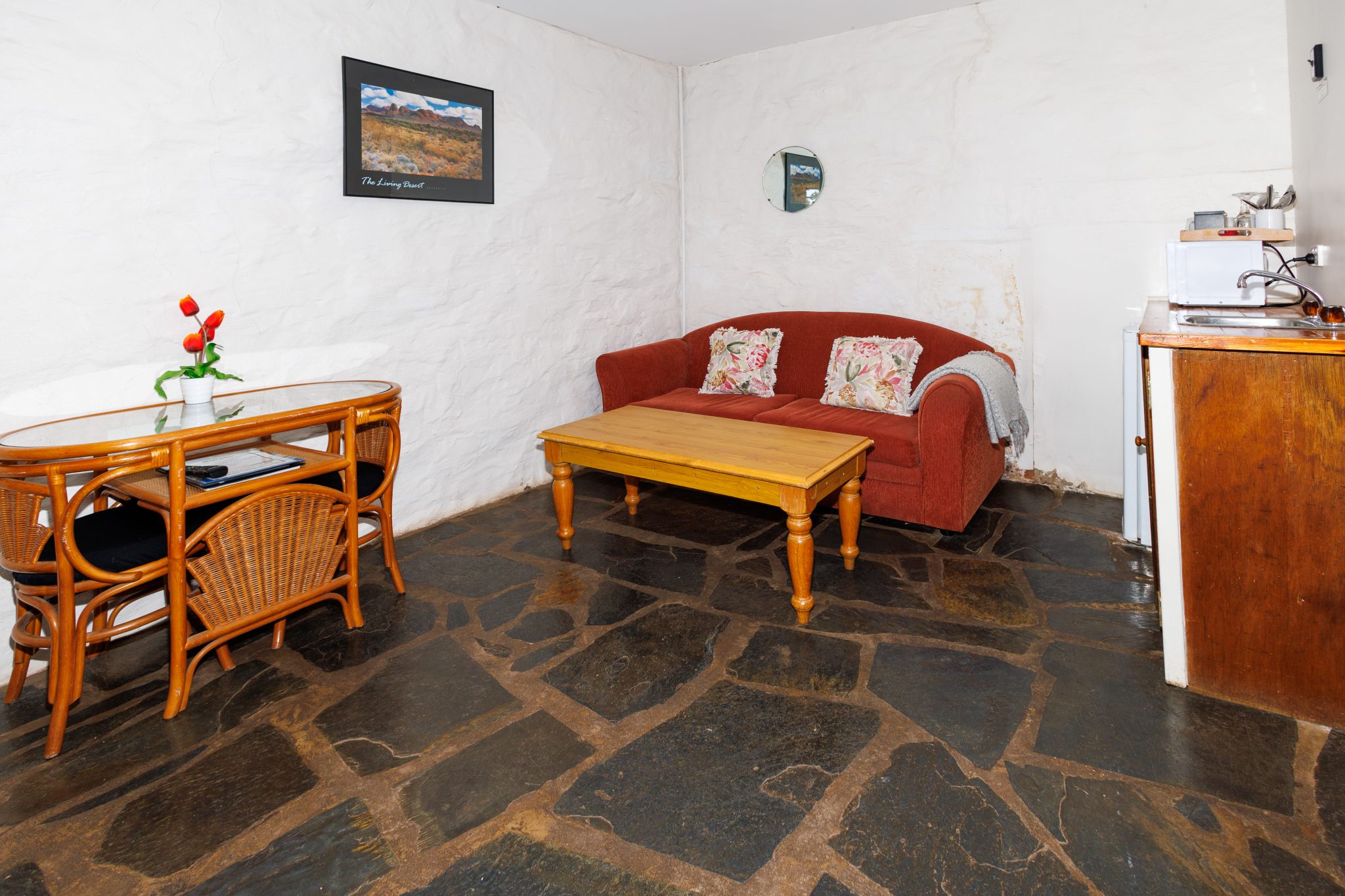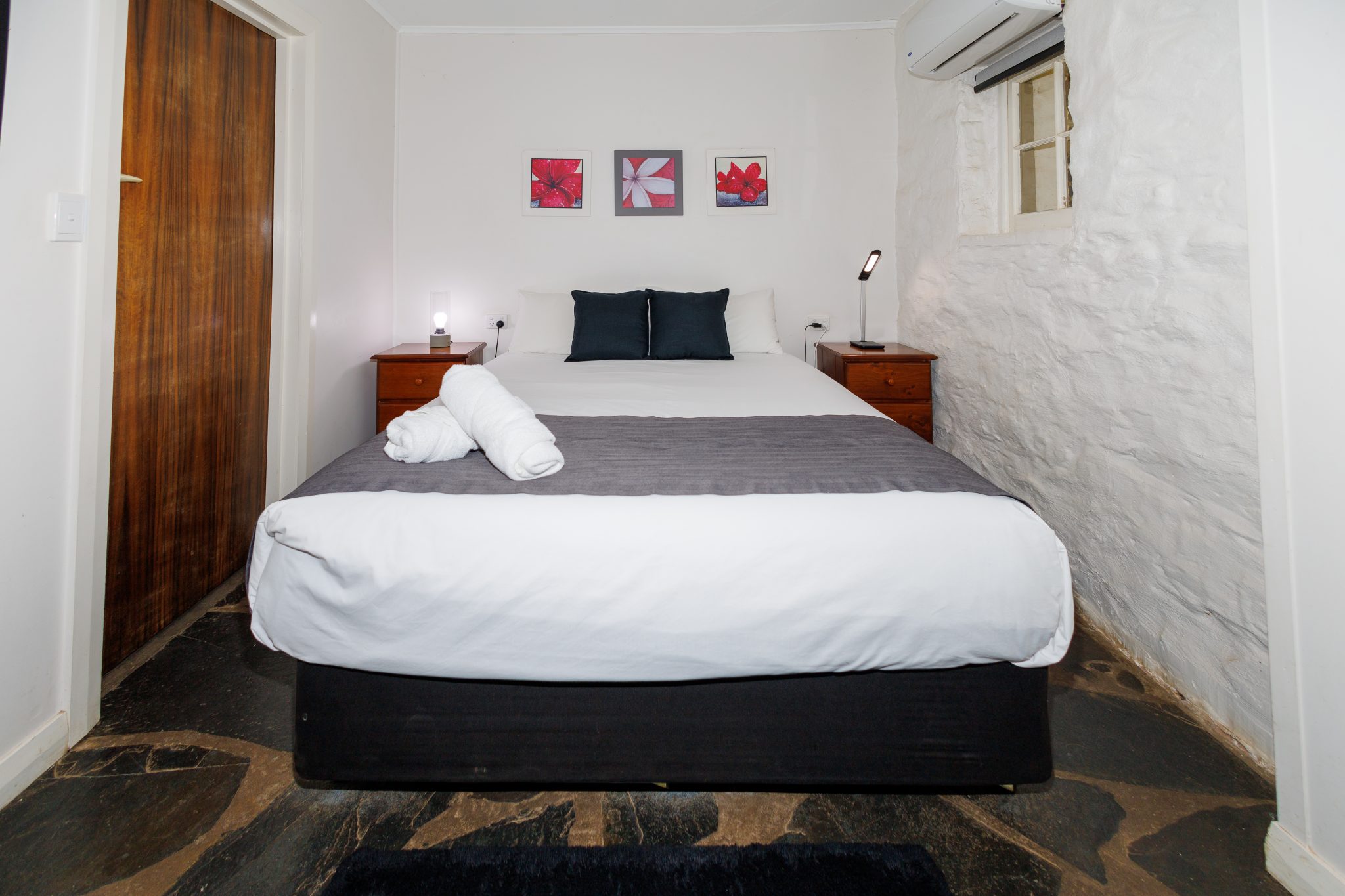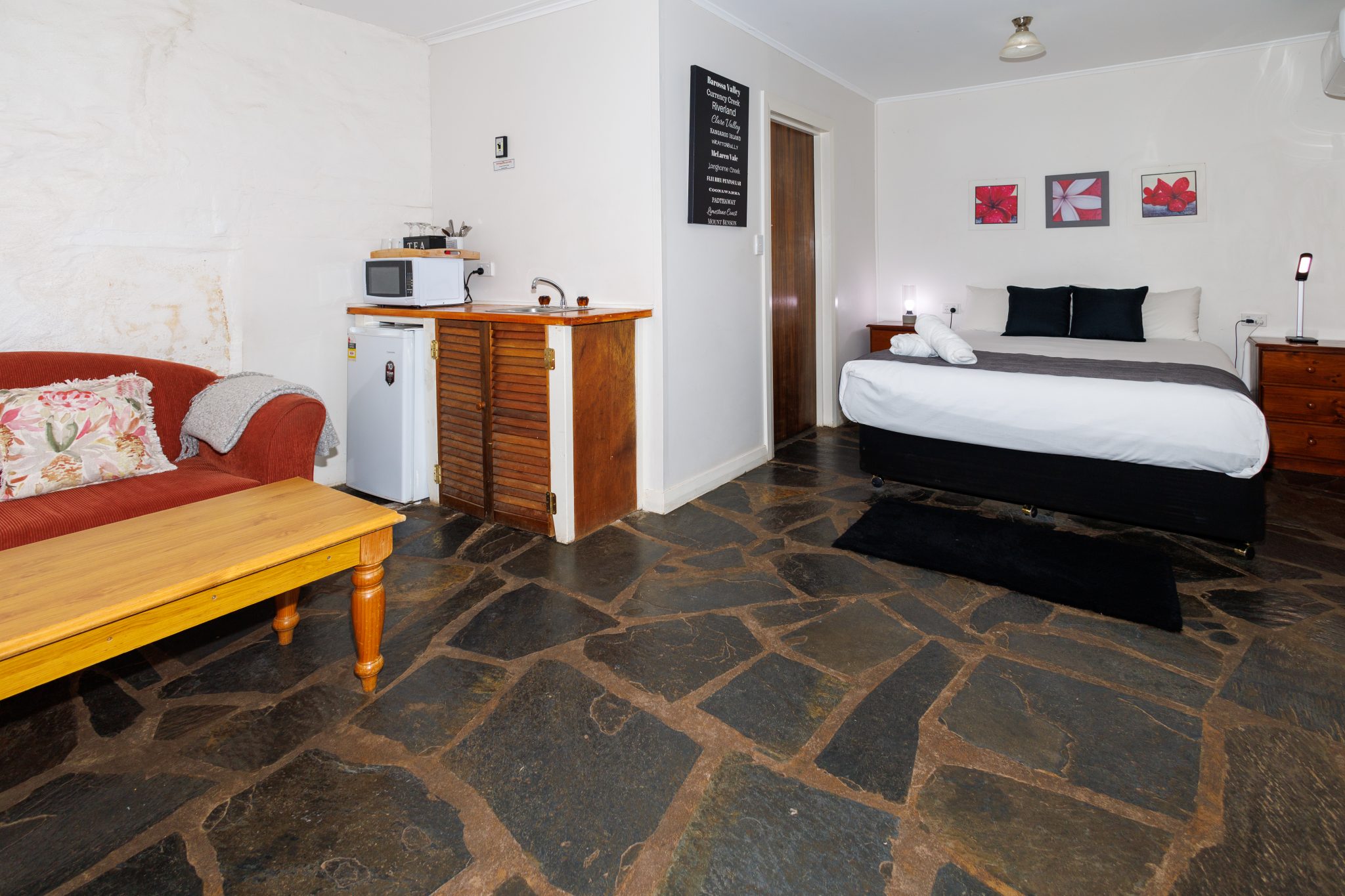 This is a motel room style of accommodation, using part of the original shearer’s accommodation. We have created a motel style studio room with a queen bed, a double sofa bed and a private bathroom. It has a lovely verandah that overlooks the lawn area with views to the sea, the Ringers Room is an ideal spot on a hot day with its thick stone walls. With RC/AC, tea & coffee making facilities plus a fridge, toaster and microwave. We especially recommended booking The Ringers Room if you are coming in late or need to head off early.