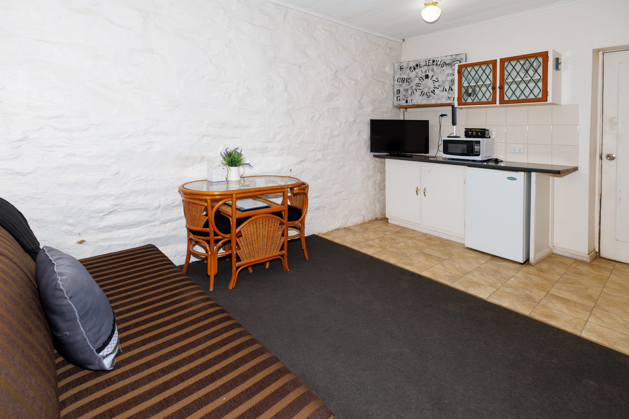 This is a motel room style of accommodation, as the name suggests we have used a portion of the original stone shearers quarters accommodation. We have created a studio/ motel style room with a queen bed, a double sofa bed and a private bathroom. It has a lovely rustic verandah that overlooks the lawn area with views to the sea. The Shearers Quarters is an ideal spot on a hot day with its thick stone walls. With RC/AC, tea & coffee making facilities plus a fridge, toaster and microwave. We especially recommended booking The Shearers Quarters if you are coming in late or need to head off early.